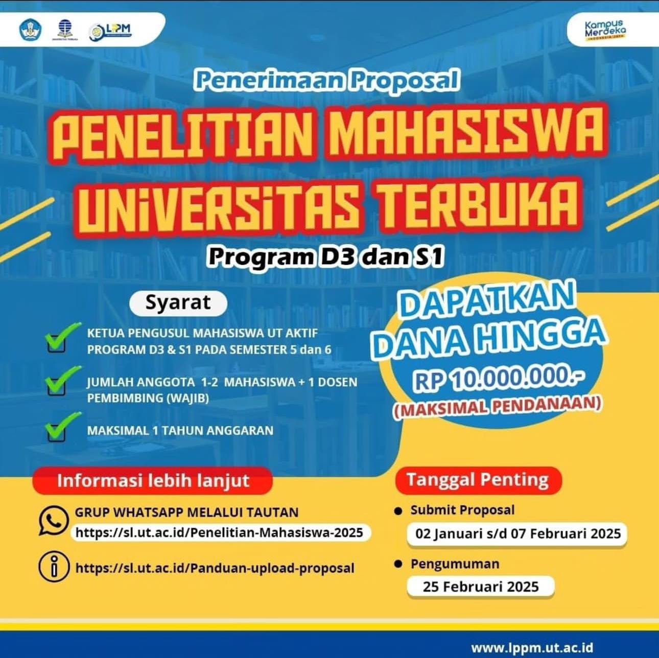 Universitas Terbuka, 14 Maret 2025– Universitas Terbuka (UT) dengan bangga mengumumkan bahwa 44 mahasiswa telah terpilih sebagai penerima Hibah Penelitian Universitas Terbuka untuk tahun 2025. Program hibah penelitian ini bertujuan untuk mendukung dan mendorong mahasiswa UT dalam mengembangkan penelitian yang bermanfaat bagi ilmu pengetahuan, teknologi, serta masyarakat.